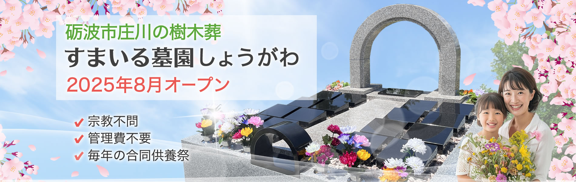 道の駅 庄川から徒歩約5分の立地に、新しい樹木葬が誕生いたしました。宗教不問、管理費不要で、どなた様でも安心してご利用いただけます。生前申込も可能です。